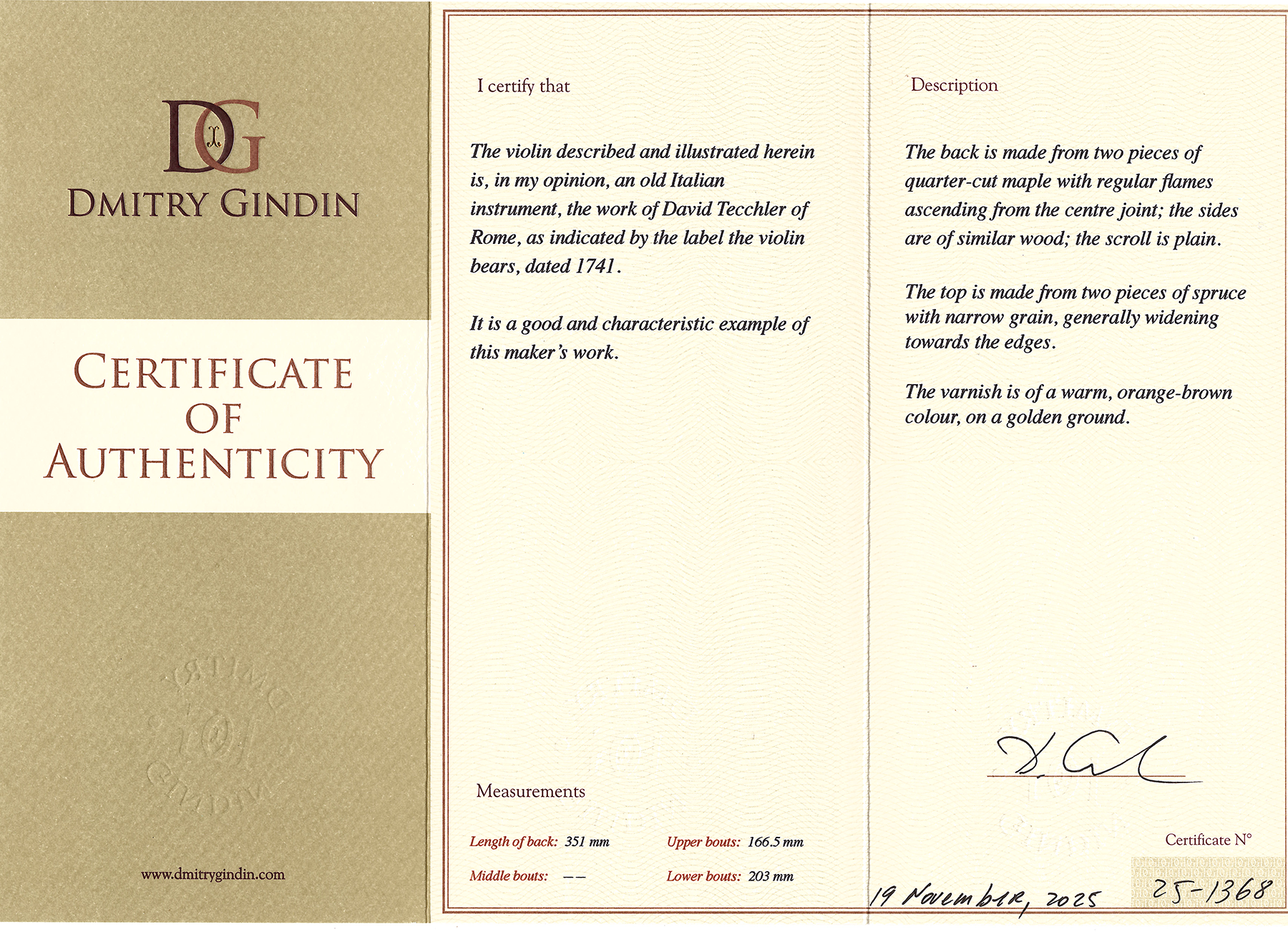 Original label, beautiful golden orange lacquer on a yellow background of high quality, flawless and rarely in good condition. The violin is a unique perfect example. Sound**** outstanding instrument, extensive enough for any concert hall